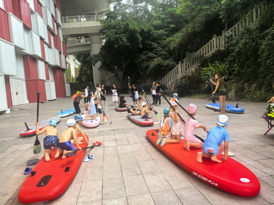 团队成员首先用通俗易懂的语言向小学生们介绍了桨板装备的基本知识及水上遇险时的应对原则,随后,老师们现场示范了正确的握桨姿势、划水动作等桨板操作基本功,并指导同学们在岸上进行了划桨实操练习。在团队教师和学校老师的周密组织与全程监护下,参与活动的同学们分批有序地进行了亲水体验。他们踏上桨板,在浅水区域尝试运用刚刚学到的划桨技巧。老师们耐心细致地进行手把手指导,及时纠正动作,确保每位同学都能在安全的环境中初步感受桨板操控的乐趣,掌握基础技能。