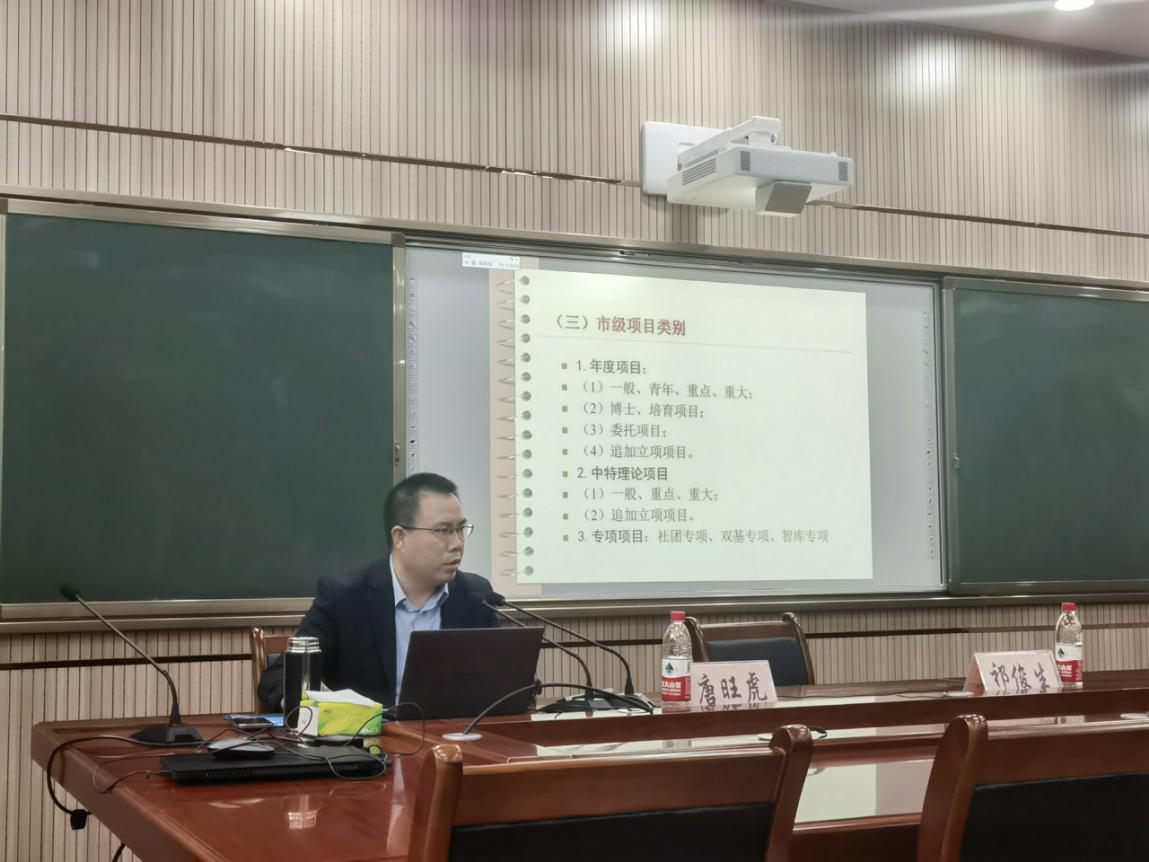 首先,唐主任将近年重庆高校社科立项相关数据进行了统整、分享。同时从哲学社会科学的时代使命;强化“学术”的建议;社科项目申报中存在的问题;社科项目申报中的重点环节等多方面进行了深入浅出的讲解。其次,强调要充分结合和发挥我校区位优势,打好“三峡牌”、做深做实有关“三峡元素”的挖掘与整理。最后,唐主任同与会教师进行了深入交流,并鼓励在座的教师和科研人员积极投入社会科学研究中去。