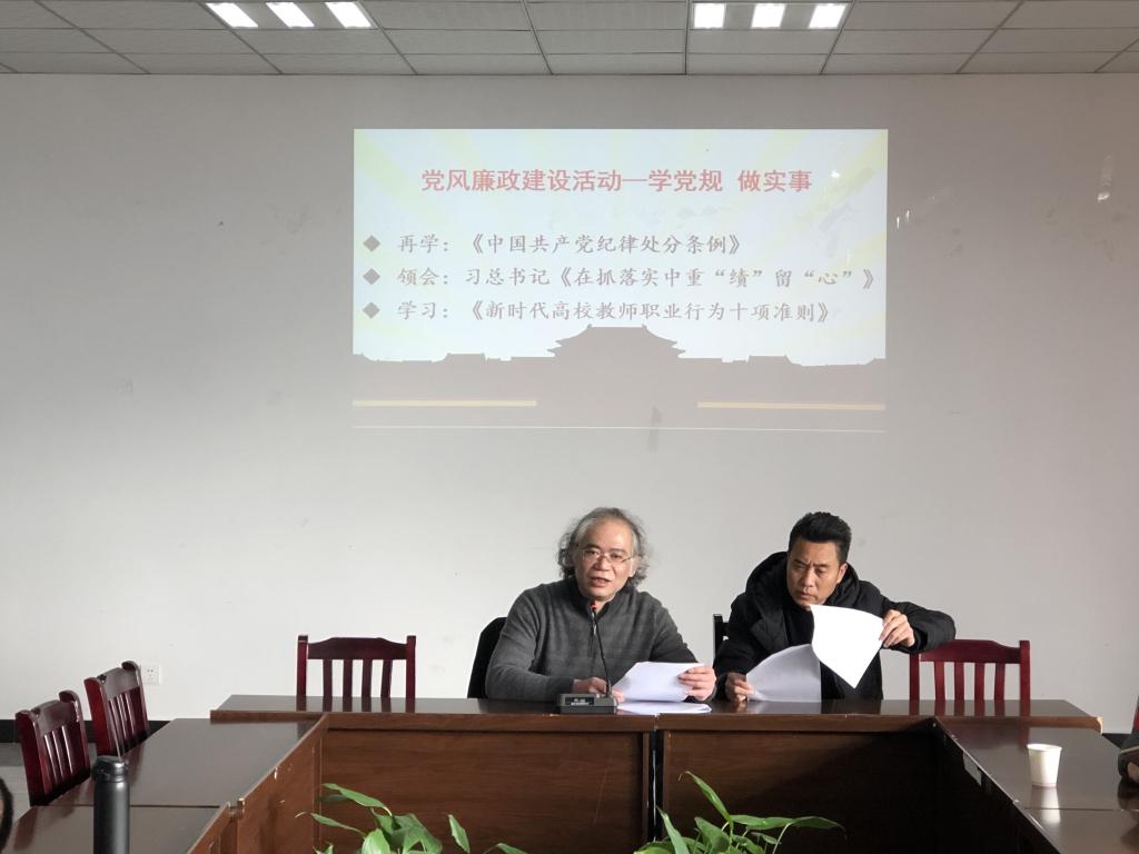 2018年12月20日开元开展党风廉政建设活动—学党规 做实事,由漆勇书记主持,组织与会人员,再次进一步学习《中国共产党纪律处分条例》,解读《在抓落实中重“绩”留“心”》一文,学习《新时代高校教师职业行为十项准则》,传达重庆市全市教育大会精神。