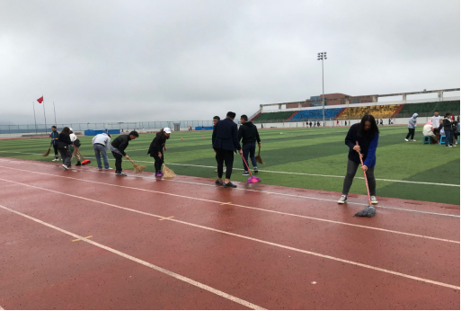 ——2019年10月7日上午,开元学生党员开展为师生员工办实事好事活动。在支部书记胡彩凤老师的带领下,来到了学校田径场上,大家人人动手,不怕脏不嫌累,清理田径场上各个角落范围内垃圾。党员们热情高涨,积极参与,看到正在体测的同学,主动把跑道上的积水扫干净,防止摔倒。他们辛勤劳动的身影成为校园内一道亮丽的风景。在大家的努力下,田径场上的面貌焕然一新!