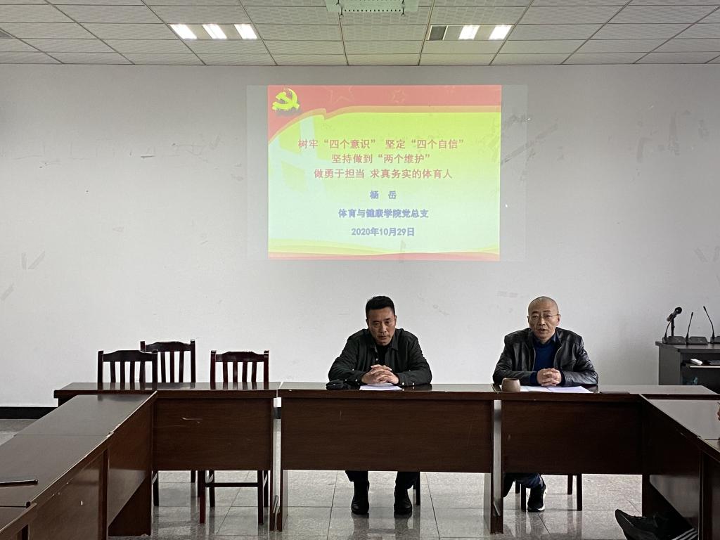 随后,杨岳书记以“牢固树立‘四个意识’,坚定‘四个自信’,坚决做到‘两个维护’,做勇于担当、求真务实的体育人”为主题,深入浅出地为全体教职工党员上了一堂党课。杨书记以自己重温十九大报告为例,讲述了如何站在体育人的角度学习党中央的相关政策和文件精神。阐释了“两个维护”的重要性。最后,号召体育学院全体党员同志要提高自身政治站位,强化政治责任,保持政治定力,把准政治方向,提高政治能力,增强斗争精神。要团结学院每个教职工,在体育学院领导班子带领下,齐心协力,搞好学科建设,提高教学质量和科研水平。做一个勇于担当、求真务实的体育人。