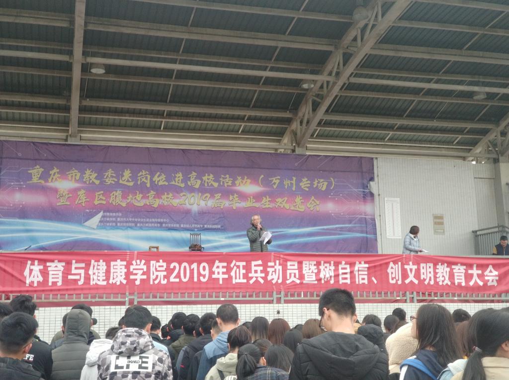 2019年3月24日下午在百安校区田径运动场,开元召开2019年征兵动员暨树自信、创文明教育大会。党总支书记漆勇、学工办副主任胡彩凤、辅导员陈果、佘港,班主任何兴权、陈亿、许庆、李文亚、郑晓老师出席会议,全院学生参加,会议由学工办副主任胡彩凤主持。