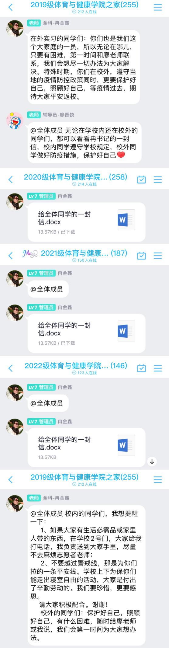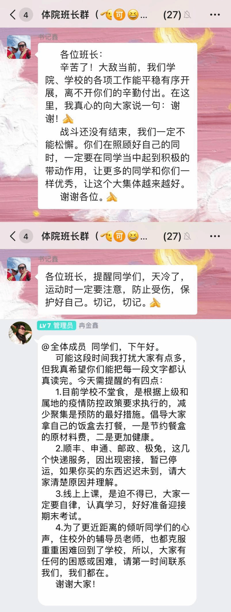 在信上,冉书记提到以下几点:1、通报了当前全市以及教育系统疫情的严峻形势;2、我校目前的平稳状态,以及这份成绩背后全校上下各行各业的人们默默的付出,教育同学们要珍惜,要学会感恩; 3、肯定同学们为这场疫情歼灭战所付出的努力,引导大家用积极的心态面对眼前的困难; 4、对学生日常生活的慰问与关心,以及特殊时期如何管理好自己提了希望与要求。