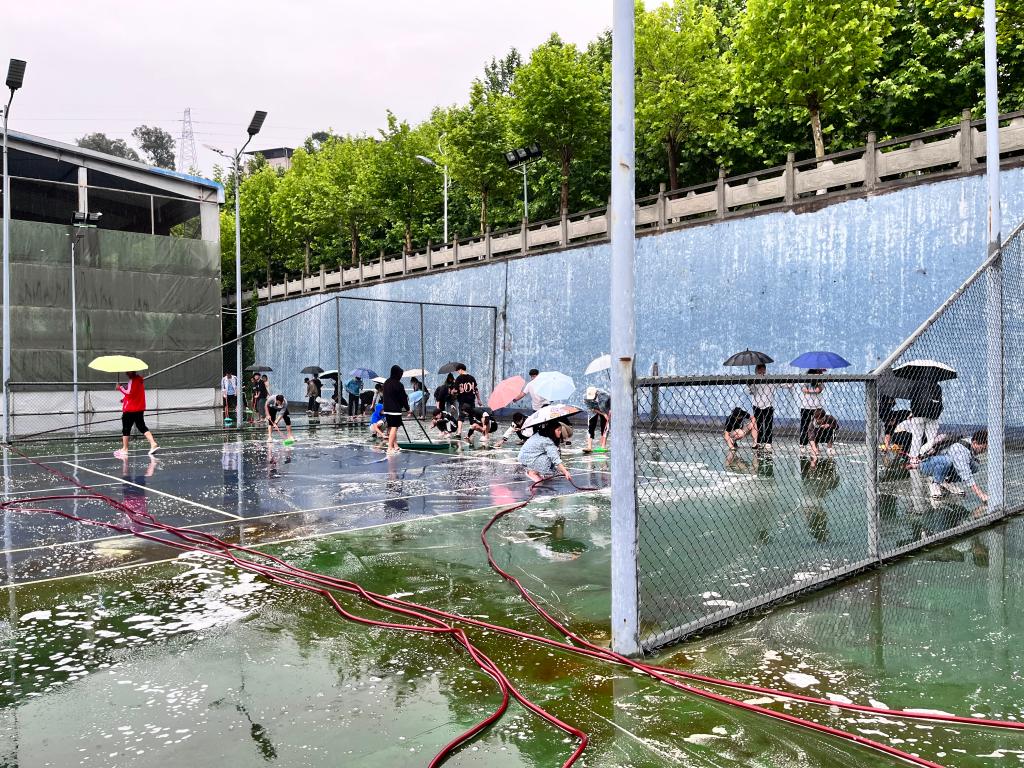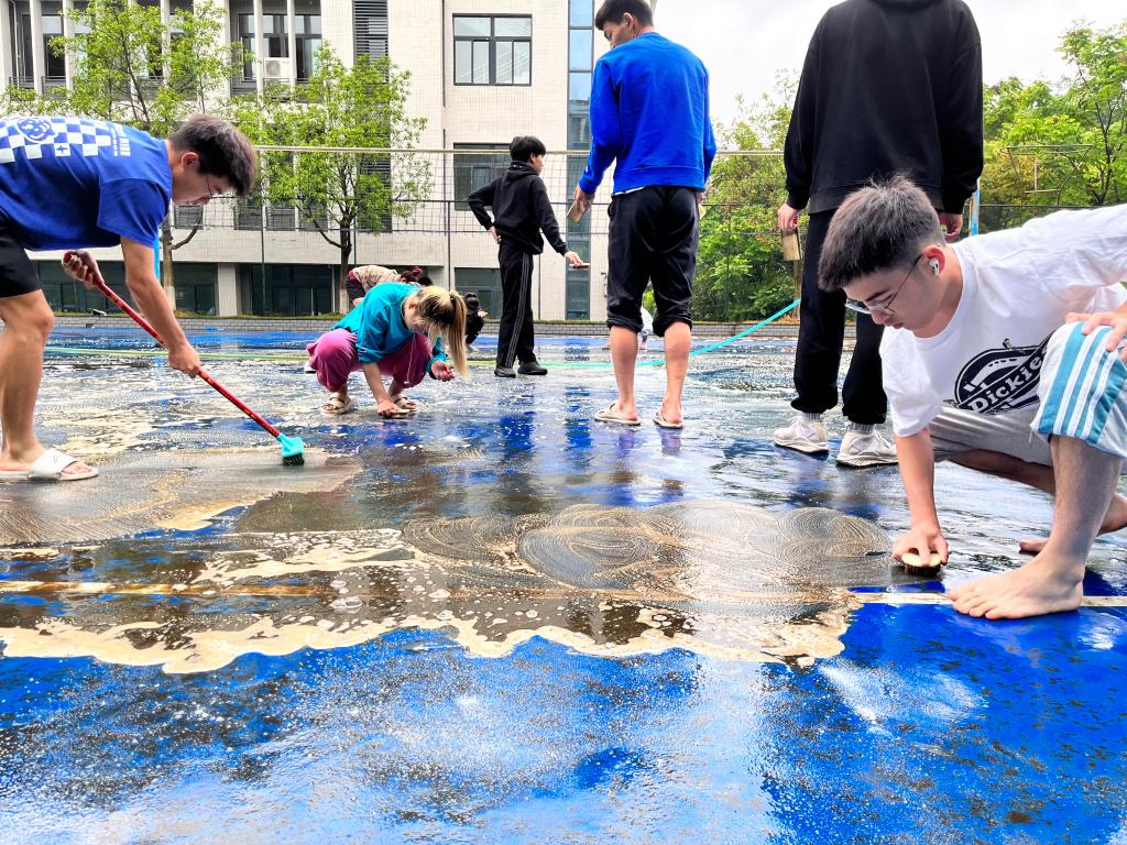 在整个清扫活动过程中,同学们埋头苦干,挥汗如雨,手里拿着清扫工具,谁也不吭声,只是闷头猛劲干,好像在暗中比赛似的。虽然中途天空突然下起了雨,但是没有一个人举手“投降”,大家都在努力的清洗,等待着“胜利”的到来。