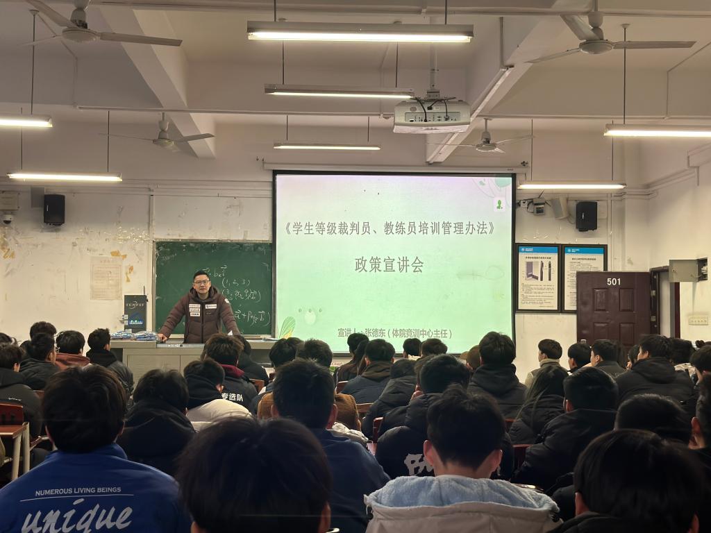 为培养学生德智体美劳全面发展,做好高校全方位、系统的服务育人工作,2024年3月3日,开元利用周前会邀请竞训中心主任张德东为全院学生宣讲《学生等级裁判员、教练员培训管理办法》政策。