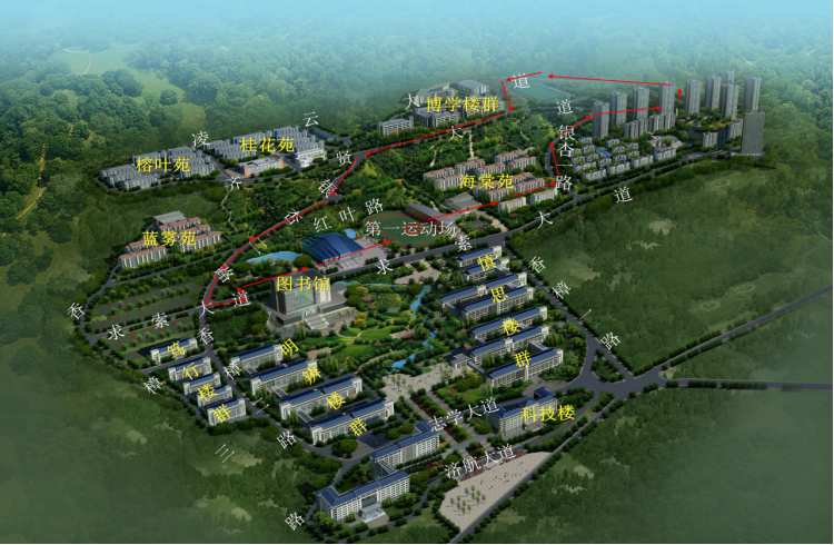 学校田径场(起点)→学生海棠苑→左转南浦苑2号门→银杏一路→齐贤大道→博学楼→向左沿银杏二路→篮球场处左转→红叶大道入口→游泳池→田径场(终点)